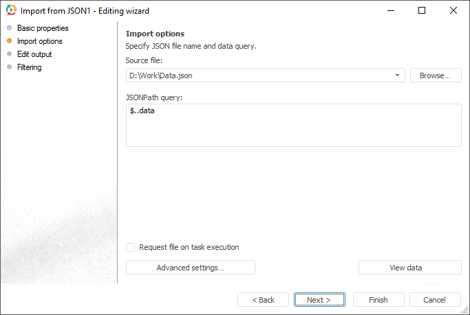 In the Source File box, specify path to the JSON file that should be used as a data provider. Click the Browse button to select a file. Specify the JSONPath query in the JSONPath Query box, according to which imported data is selected.