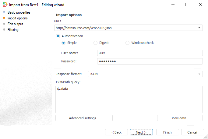 Use the URL box to specify URL of the REST service that gives data (the current realization enables connection to REST services that given data only in the JSON and XML formats).