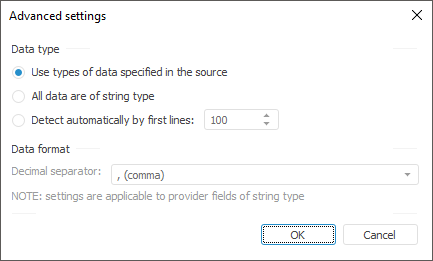 To determine data type of imported fields and other parameters, use the Advanced Settings dialog box.