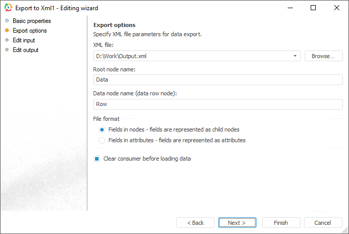 Specify name of the mandatory root element of the output XML file in the Root Node Name box, and the name of data containing element in the Data Node Name box.