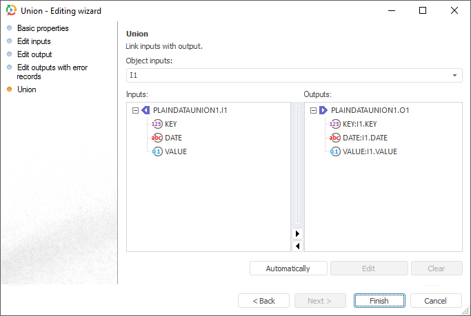 Creating links manually. Drag input field to output field, or select these fields and click the Edit button.