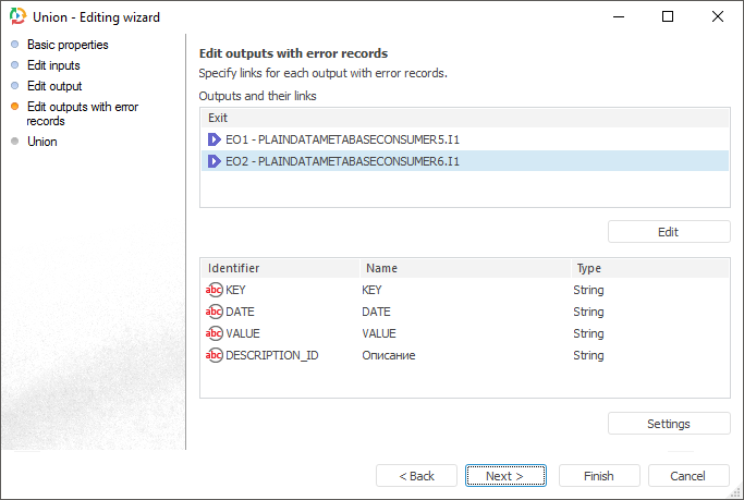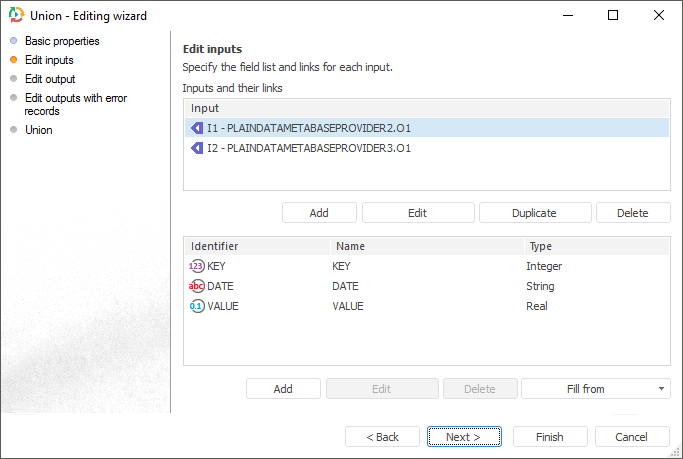 The Union transformer is an object that merges data. Each of the objects has several inputs and a single output. Each provider should have a unique index, number and types of fields. The specified attributes should be identical for all providers. Duplicate records are not allowed (duplicates must be deleted beforehand).