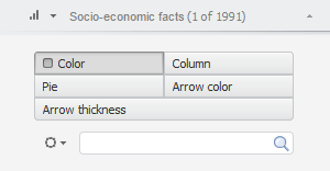 By default the metrics dimension determines only territories fill color and data sources for pie and column charts on a map. If the 3D mode is enabled, showing markers, arrows or other parameters is enabled, the set of controls is shown on the dimension tab. For example: