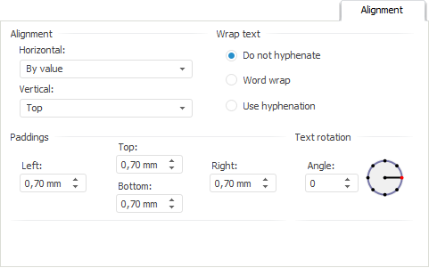 The Alignment tab is used to determine value position in the cell. Cell value can be aligned horizontally and vertically with selected rotation angle and paddings from the cell borders. Wrap method can also be selected for string values.