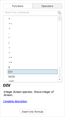 To get a brief description of function or operator, select it on the functions panel. The description is displayed at the bottom of the panel. The desktop application enables the user to get a link to a full description of function or operator. To do this, click the Full Description link located at the end of the brief description.