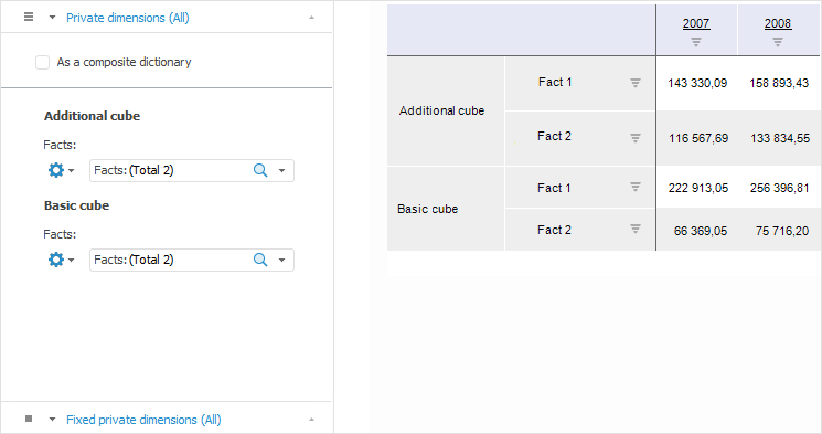 For example, report data sources have one unique dimension which contains cube facts. After private dimensions are located in columns, the report will have strict data division by source: