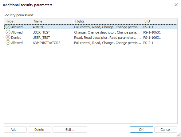 This dialog box displays the name of the selected security subject and a list of detailed permissions for this type of objects. To allow or deny executing specific operations with an object, select corresponding checkboxes next to the required operations.