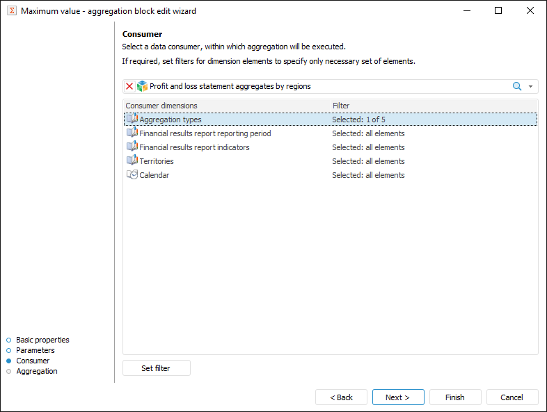 A data consumer can be selected and set up on the Consumer page in the aggregation block editing wizard: