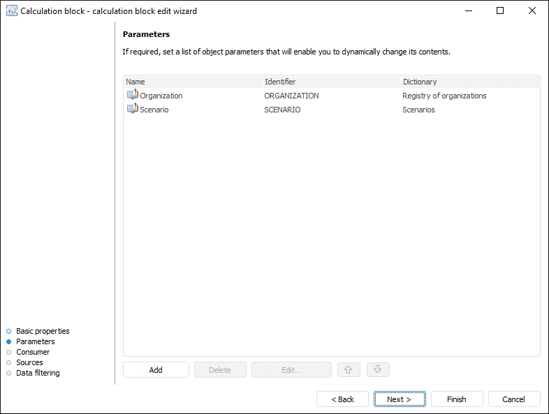 Calculation block parameters can be added on the Block Parameters page in the calculation block editing wizard: