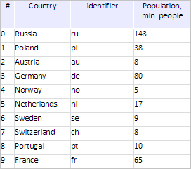 To execute the example, the HTML page must contain the DataGrid component named grid (see Example of Creating the DataGrid Component). Move a column with the id identifier to the position to the left of the column with the popul identifier, output identifiers and names of all table columns in the direct order: