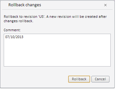After executing the example the WorkbookBox component and a button named Source are placed in the HTML page. To execute the example, select the Data tab in the workbook side panel. Switch to the panel, whose name matches name of time series database, select an available revision and click the Source button. The Source Set label shown on the button indicates that a data source is currently set for the time series database revisions panel. On selecting an available revision and clicking the Rollback button in the panel, the following window appears in the screen: