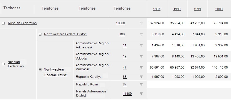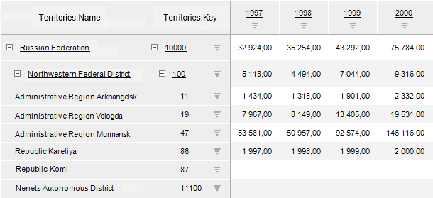 Executing the example requires that the repository contains an express report with the EXP_REP identifier. The table sidehead displays the Name and the Key attributes as names. Sidehead dimension has several levels.