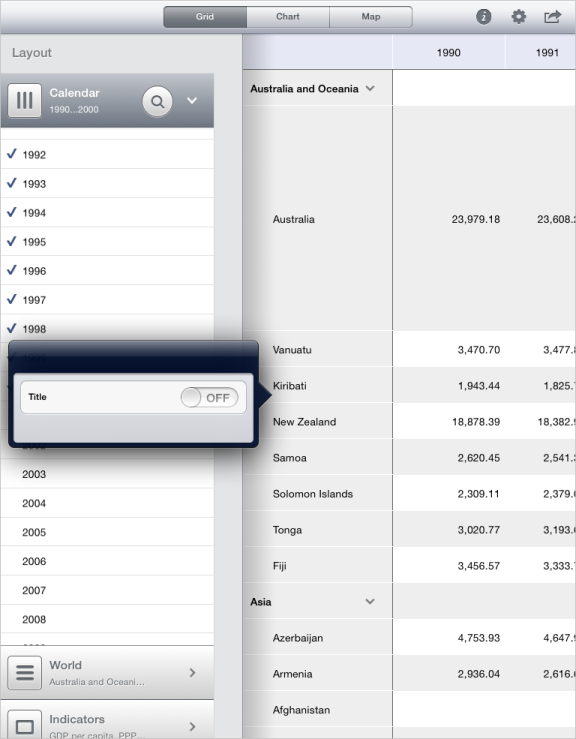 After executing the example the mobile device screen displays the express report containing the table, for which express report settings popup window is displayed, and also height and width of the specified rows and columns are changed: