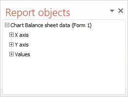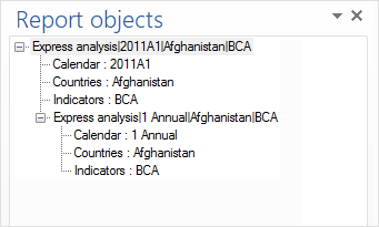 On adding report objects to presentation, the Report Objects panel is used to work with them: