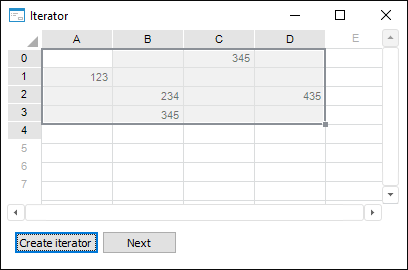Click the Button2 button (the Next button in the given example). The first cell containing the value (the cell A1 in the given example) is selected. The further clicking on the Button2 button selects the cells by which the iterator moves. The move order is set By Columns and the cells are selected in the following order: A1-B2-B3-C0-D2. At the move order selection By Rows the cells are selected in the following order: C0-A1-B2-D2-B3.