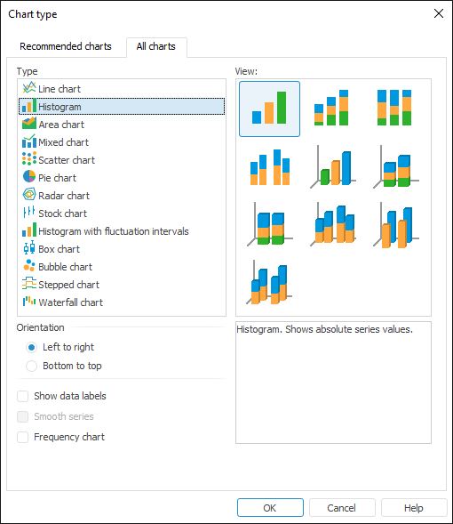 NOTE. On changing chart type the previously configured binding of series to secondary axis is saved for all chart types, except for the histogram with grouping and the stock exchange chart with the opening rate.