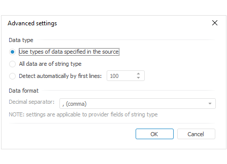 NOTE. Advanced settings of imported data type and format are available for all data sources, except for time series database.