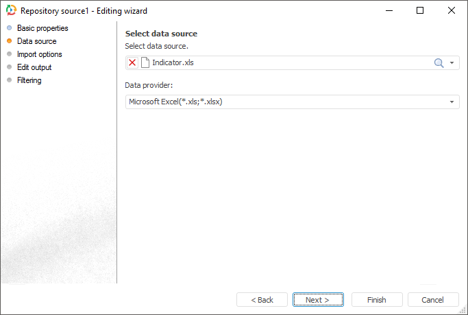 This page is displayed if the Document repository object with file loaded to it is selected as data source.