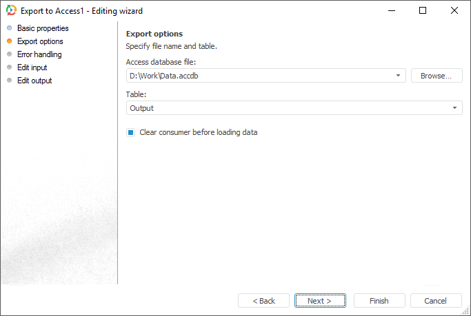 Specify path to the Microsoft Access file, to which the data should be loaded.