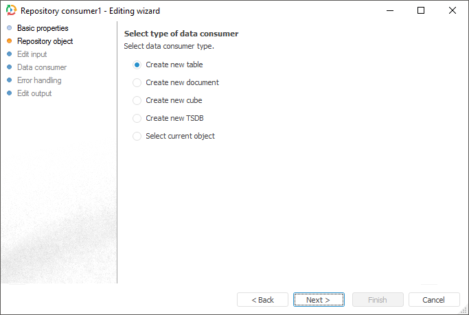 If a new consumer is created, and the option of creating a new object is selected on the Repository Object page, on moving to the current page it is prompted to save a new object to repository. The created object is automatically selected in the drop-down list. The list will also contain the filter that enables the user to select other object of one type that was specified on the Repository Object page.
