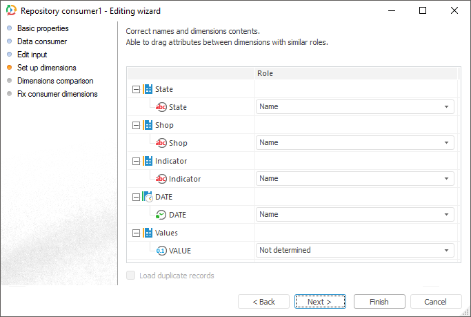 To link dimension with existing dictionary, select dictionary in the drop-down list next to required dimension. The following items are available for selection: