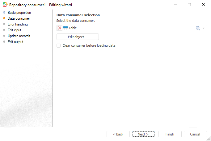 NOTE. On selecting a standard cube as a consumer, time series database, table MDM dictionary or composite table MDM dictionary, the Clear Consumer Before Loading Data checkbox and the Edit Object button are not available.