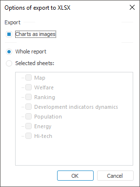 On exporting to PPTX presentation, each printed table is exported to a separate slide. Charts and maps are also exported into separate slides as images.