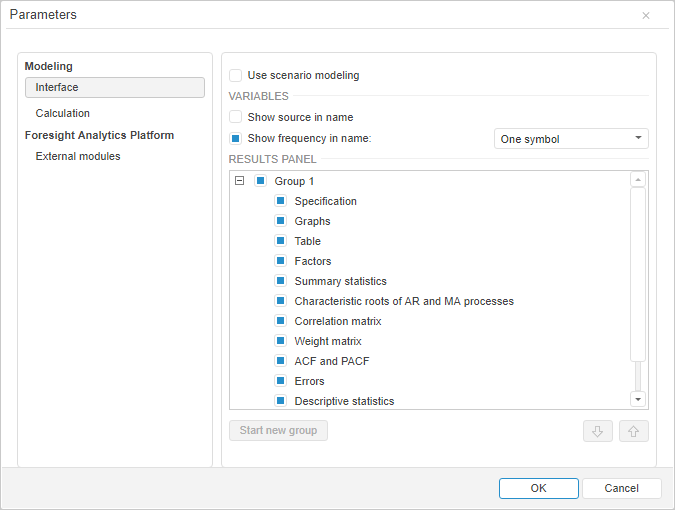 To set up parameters of the Modeling and Forecasting tool and general parameters of Foresight Analytics Platform, use the Parameters dialog box.