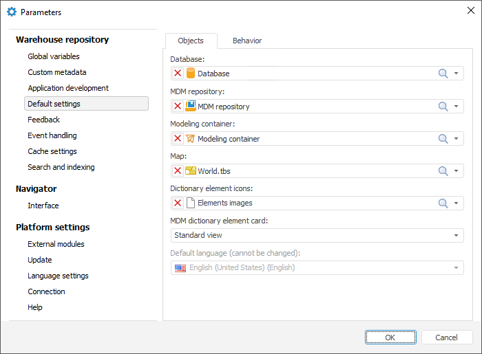 Default repository settings help to determine objects or object behavior which will be used in the Foresight Analytics Platform tools with no need to select it again. For example, a default map will be used in all reports.