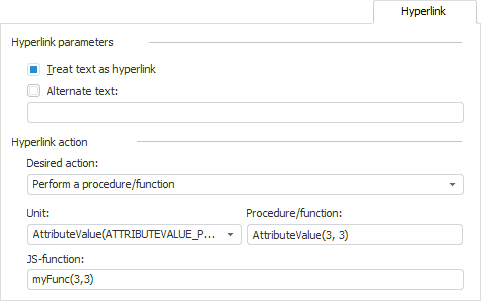 Open the Cell Format dialog box for a cell in regular report. Go to the Hyperlink tab, specify the created unit, procedure and JS-function in the corresponding boxes: