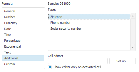 The tab contains the list of predefined formats for displaying sheet cells contents. Select required data format and set its parameters. Tab appearance and settings depend on the tool in use.
