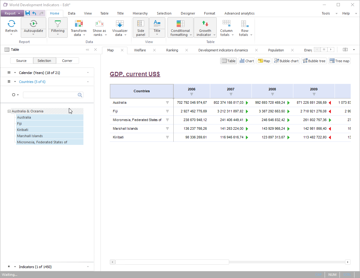 When an operator is inserted, the elements list also contains calculated dimension elements. Therefore, they can also be selected to create an operand selection.