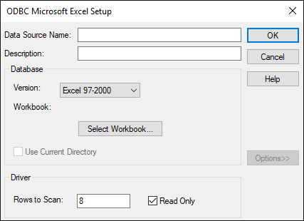 Dialog boxes have different view according to the selected driver. Example of the dialog box to set up the Microsoft Excel driver: