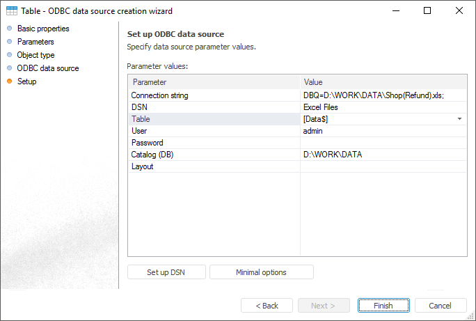 If a new data source is created, click the Minimal Options button to set up the driver. For more information about installing drivers for external sources, consult the standard ODBC reference manual, which opens on clicking the Help button in every driver installation dialog box for selected sources.