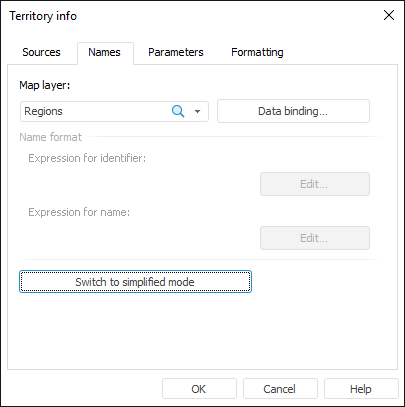 The simplified mode shows the Names tab of the Territory Info dialog box in the following way: