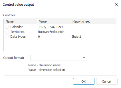Output Format. In the combobox specify format option or select the format of control values output in the list of the available options. The Name and Value substitutions are used to show control name and value respectively.