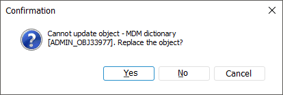 Object update can be skipped or applied. Selecting the Apply in All Similar Cases checkbox applies the selected operation to all objects with the same conflict. Clicking the Cancel button stops the entire update.