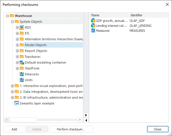 The dialog box displays a table with results of verifying the previous checksum with the current one. Identifiers, names and verification status are displayed for objects.