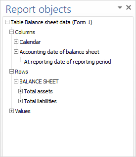 The tree-like structure of the panel is based on the dimensions of objects data sources.