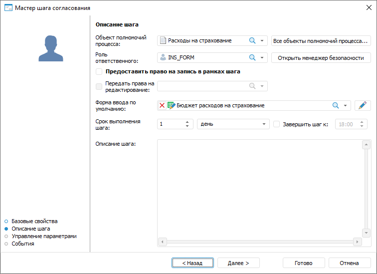 После определения параметров на странице «Описание шага» нажмите кнопку «Далее».