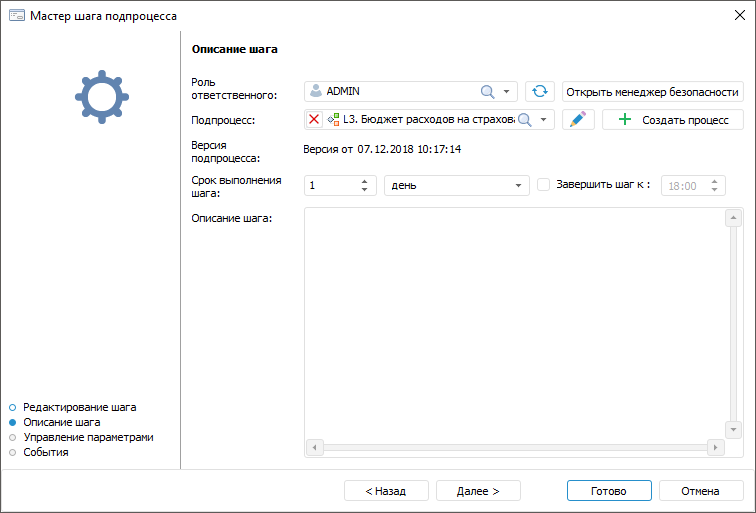 После определения базовых свойств шага на первой странице мастера нажмите кнопку «Далее». Будет открыта следующая страница мастера «Описание шага»: