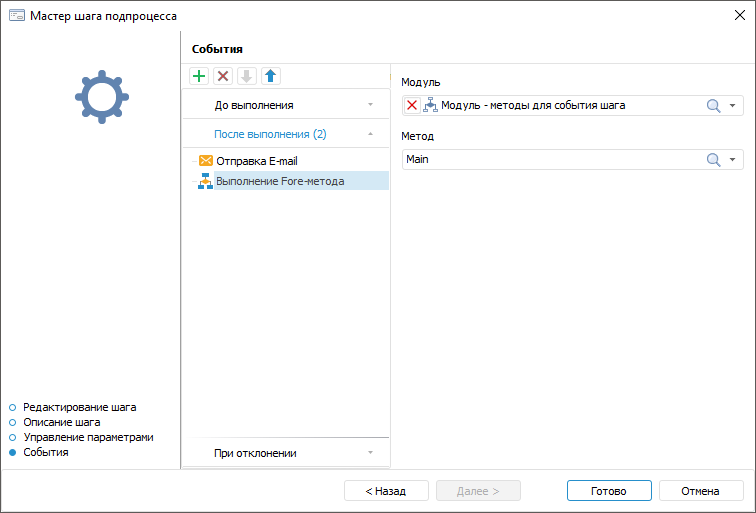 Настройте автоматически выполняемые действия, запускаемые при наступлении одного из событий: начало выполнения шага, завершение выполнения шага и отклонение шага.