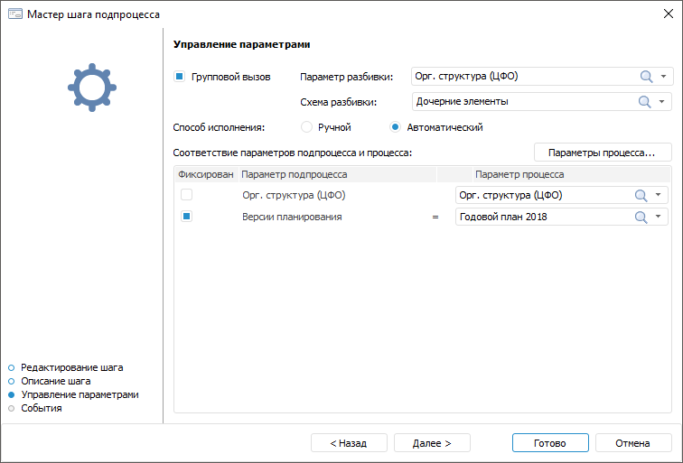 Для создания шага по запуску одного или нескольких вложенных подпроцессов с определенными параметрами откройте мастер шага подпроцесса.