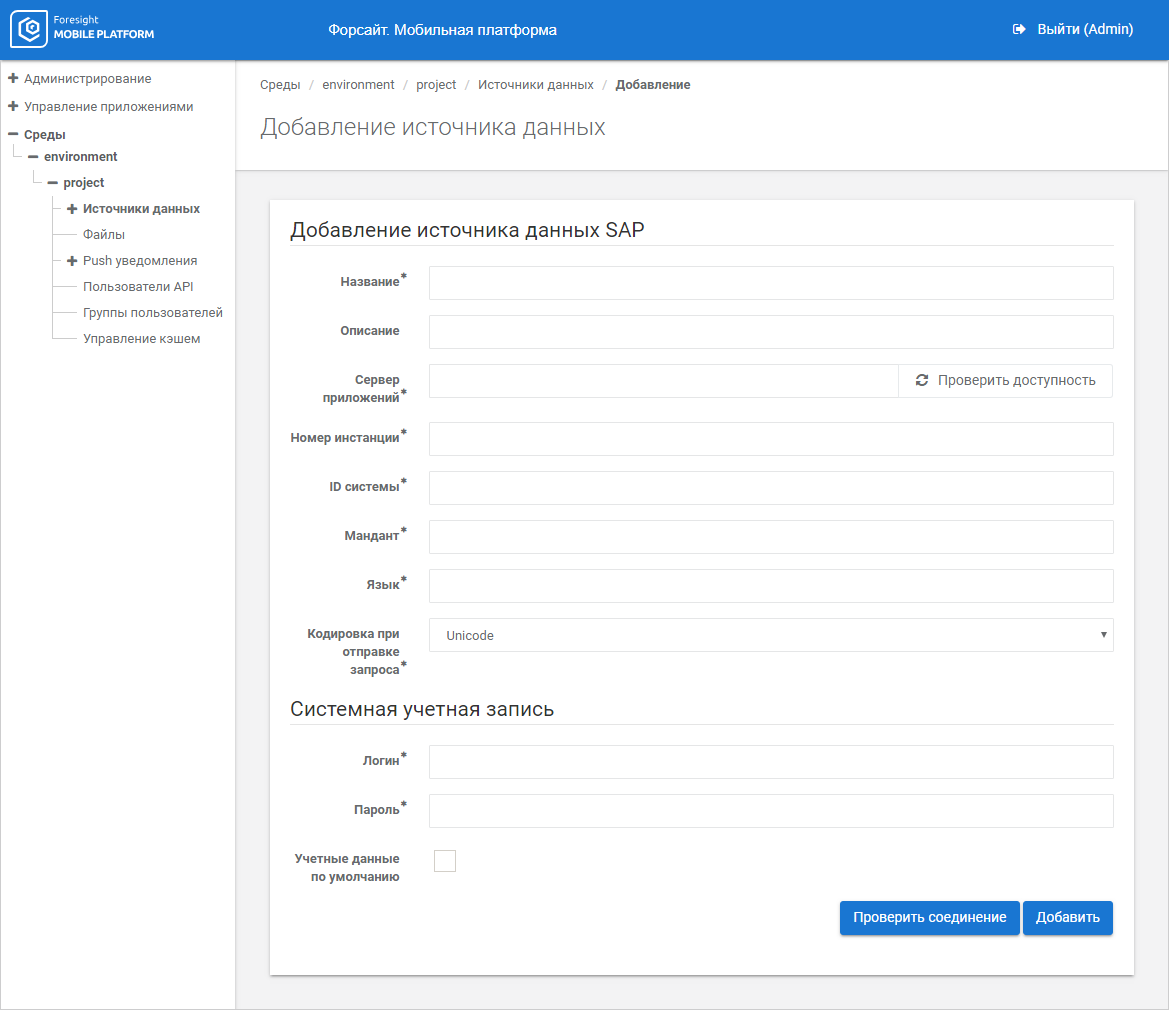 В настройках подключения сразу же доступно добавление первой учетной записи для источников данных: SAP, Postgres Pro, Oracle, SQL Server, SOAP, Foresight.