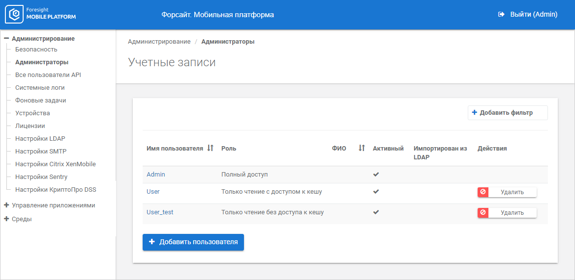 Для ведения учетных записей администраторов используйте подраздел «Администраторы»: