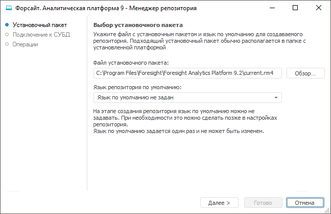 Файл установочного пакета. Для создания нового репозитория автоматически будет выбран путь к файлу с расширением *.rm4, в котором хранятся исполняемые скрипты. Данный файл входит в стандартный установочный пакет и находится по пути «S\Rm\current.rm4», где S - путь до места установки «Форсайт. Аналитическая платформа».