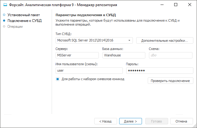 На странице «Подключение к СУБД» определите параметры, которые будут использоваться для подключения к СУБД и выполнения операций: