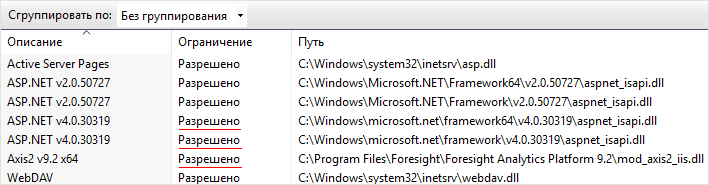 Для строк «ASP.NET v4.0.30319» и «Axis2 v9.2 x64» в столбце «Ограничение» должно отображаться «Разрешено»:
