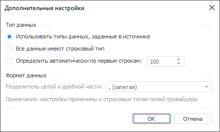 Для определения типа данных импортируемых полей и других параметров используйте окно «Дополнительные параметры».