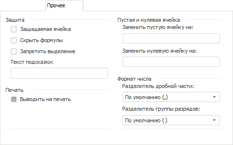 В группе «Печать» определяется необходимость вывода содержимого ячейки на печать. При снятии флага «Выводить на печать» содержимое ячейки на печать не выводится. При экспорте текст и гиперссылки, содержащиеся в такой ячейке, а также настройки ее фона экспортироваться не будут. По умолчанию этот флаг установлен для всех ячеек.